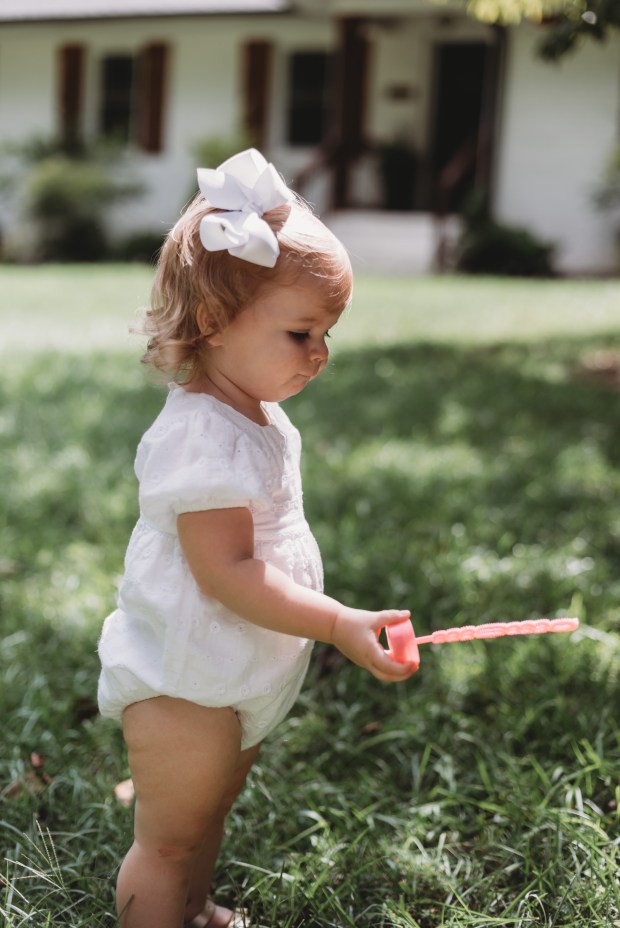 She loves to try on clothes and put on her bows and shoes! When she gets new clothes, she makes sure to show Dada as soon as she’s got it on! It’s the cutest.